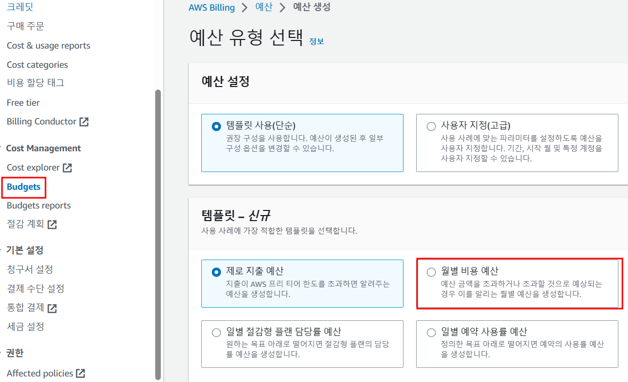 - 대시보드에서 왼쪽의 Budgets을 선택하여 설정