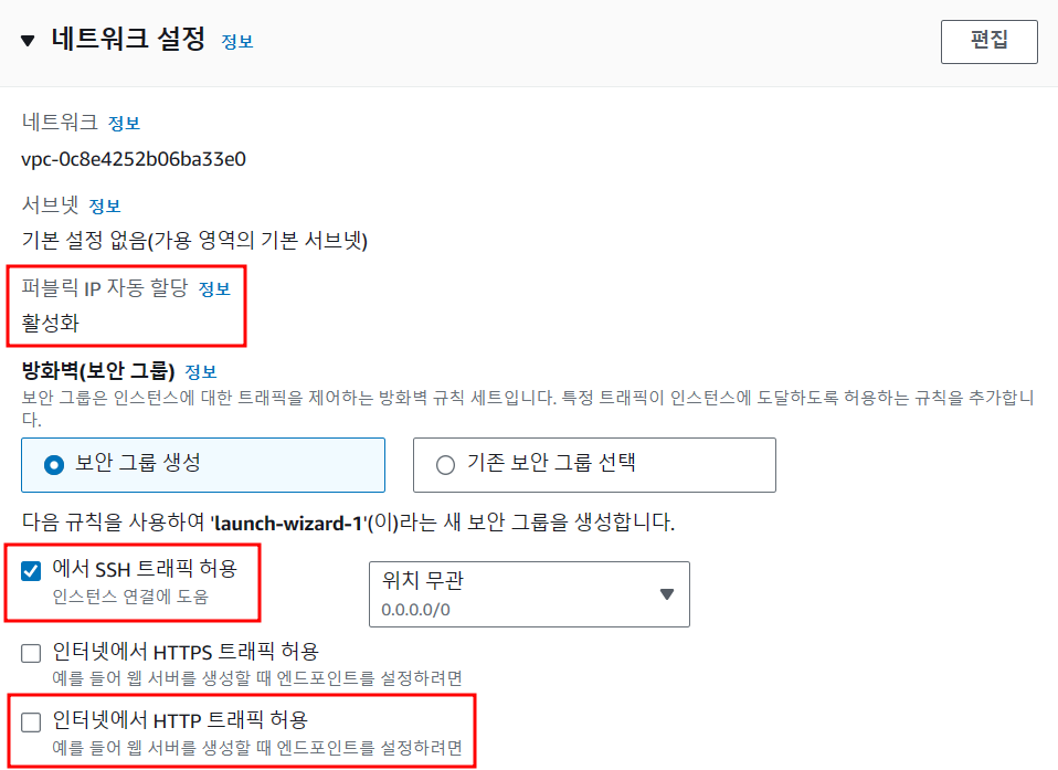 - 공용IP 할당, 보안그룹 default 값